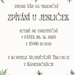 Srdečně zveme všechny farníky i návštěvníky na tradiční zpívání u jesliček, které se uskutečnív pátek 26. prosince 2025 v 15:00 hodinv kostele Nejsvětější Trojice v Kameničkách. Přijďte se společně zastavit u betléma, zazpívat si známé koledy a prožít vánoční čas v klidu, radosti a společenství. Těšíme se na setkání s vámi. 🎄✨