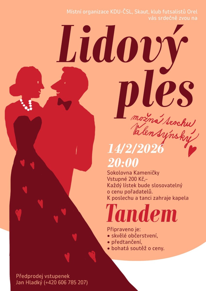 Srdečně vás zveme na Lidový ples v Kameničkách, který se uskuteční v sobotu 14. února od 20:00 v sokolovně v Kameničkách. Čeká vás příjemný večer s hudbou, tancem, občerstvením a bohatou tombolou.