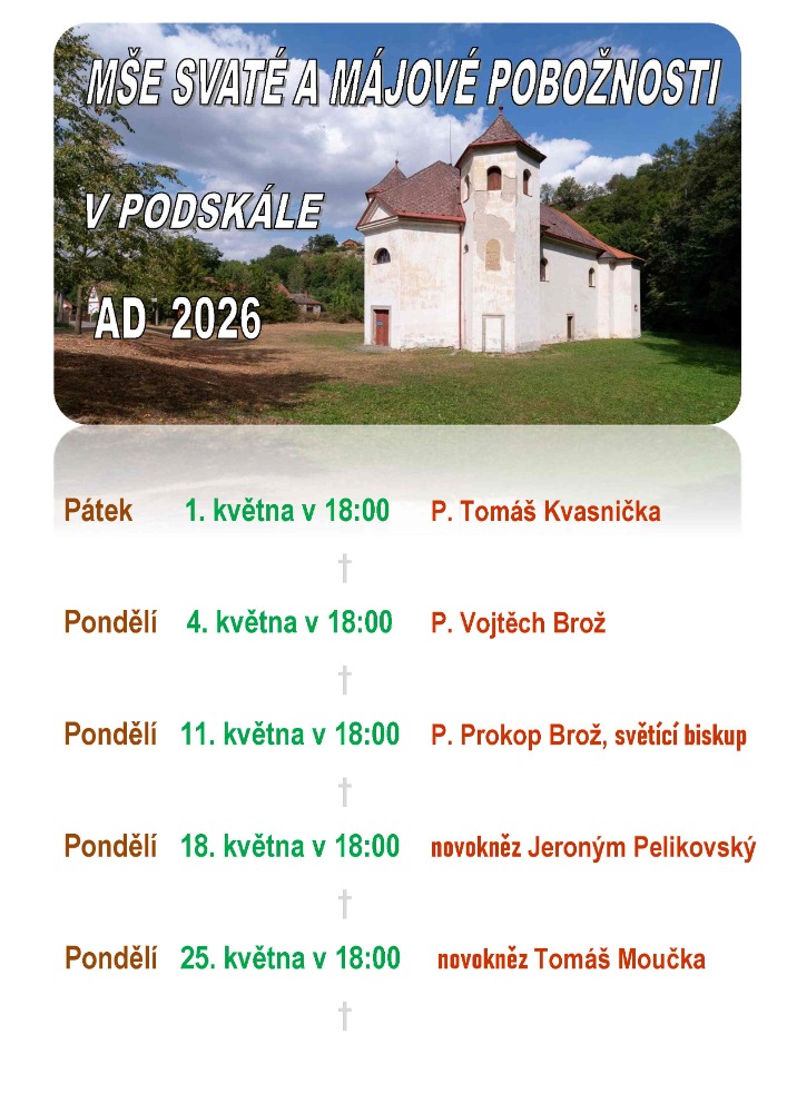Srdečně zveme všechny farníky i poutníky na tradiční májové pobožnosti spojené se mší svatou v Podskále, které se uskuteční během května 2026.